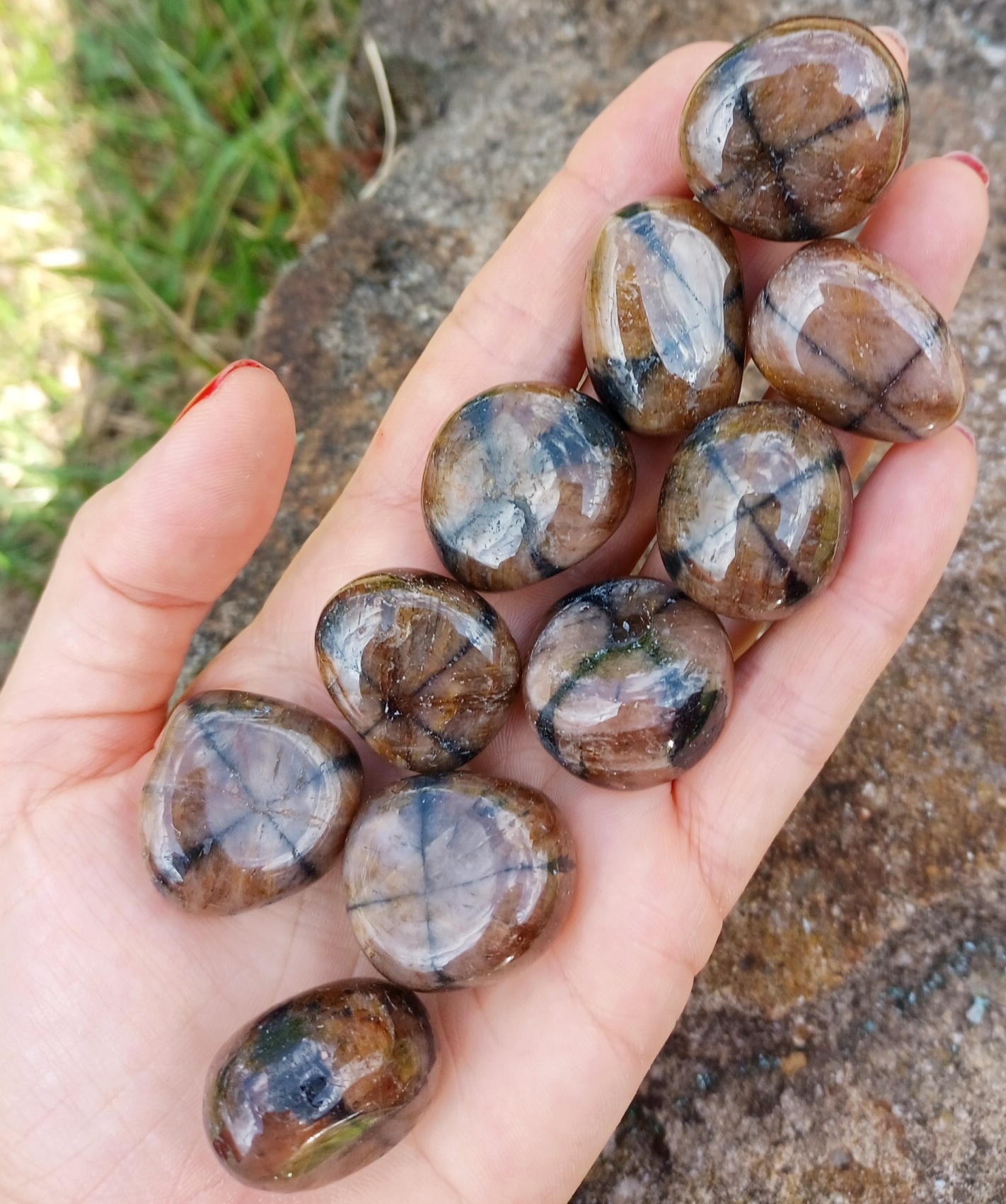 Náhodne vybraný tromlovaný kameň o veľkosti L (20-30 mm) a minimálnej hmotnosti cca 10g. Vyberáme kamene s typickou kresbou kříža.