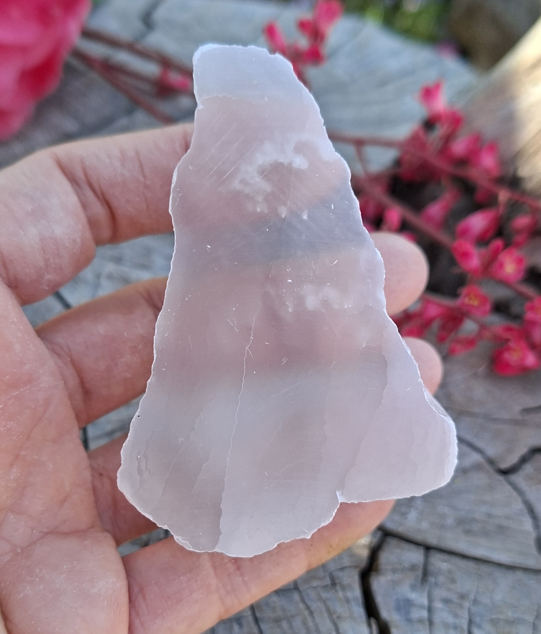 Rezaná doštička selenitu s hrúbkou cca 3 cm je leštená z oboch strán. Vďaka tomu sú kamene dostatočne pevné a stabilné, takže môžu slúžiť aj ako estetické ťažítko, pričom je zachovaná integrita minerálu. Obe leštené plochy zabezpečujú minimálny rozptyl svetla, takže svetlo môže vstupovať jednou stranou a vychádzať druhou s výrazným tzv. TV stone efektom (televízny kameň). Keďže selenit je priehľadný až takmer transparentný a vďaka kvalitnému lešteniu povrchu sa minimalizujú straty svetla rozptylom, časť svetla sa odráža alebo prechádza pozdĺž doštičky (podobne ako v tenšom sklenenom svetlovode). Leštené strany vytvárajú kvalitné rozhranie medzi selenitom a okolím, čo zabezpečuje vysokú kvalitu optického prechodu a výsledkom je výrazný vizuálny efekt. Vďaka priehľadnosti a hladkému lešteniu pôsobia doštičky selenitu ako kus ľadu. Svetlo, ktoré nimi prechádza, sa jemne rozptyľuje a povrch sa krásne rozžiari, čím získava čistý a elegantný vzhľad. Tento efekt zvyšuje vizuálnu atraktivitu a robí z doštičiek nielen optickú pomôcku, ale aj dekoratívny prvok vhodný do interiéru.