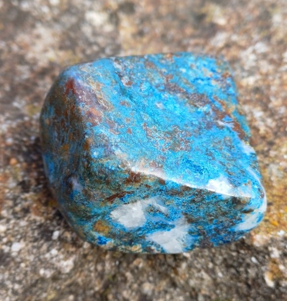 Heterogénna zmes sekundárnych medených minerálov obsahuje svetlomodrý chryzokol, tmavomodrý shattuckit, zelený malachit, hnedý kuprit, biely kremeň a ďalšie minerály. Naše kamene pochádzajú z Konga, ale hornina s podobným zložením sekundárnych medených minerálov sa nachádza na mnohých miestach sveta a každý z nich má obchodný názov podľa miesta nálezu, napr. eilatský kameň (Izrael) alebo katangit (Zair).